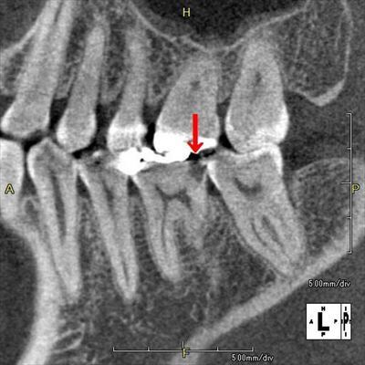 右下第一大臼歯の遠心隣接面がむし歯になっていることがCTの断面像から判ります(赤矢印)。