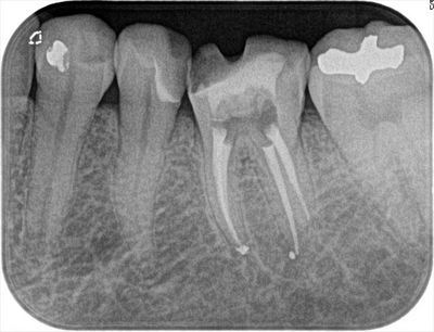 下記のブログ記事に書きました左下第一大臼歯の根管充填を本日ついに行いました。(レントゲン画像中央)