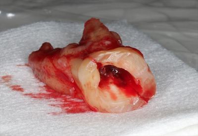 歯根の周囲にびっしりと炎症性の肉芽組織が付着しています。