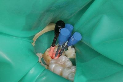 いよいよ排膿が治まりましたので、サーマフィルによる垂直加圧根管充填を行いました。
