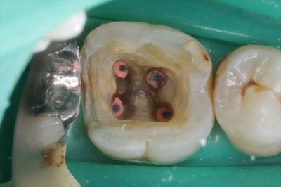 次亜塩素酸ナトリウムとEDTAで薬液洗浄後、超音波水流で洗浄し滅菌ペーパーポイントで吸水乾燥します。