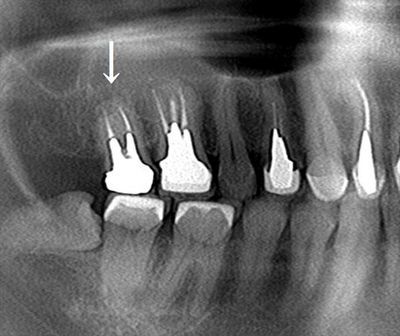 矢印部分が右上第二大臼歯であり、長いメタルコアが入っていることが判ります。