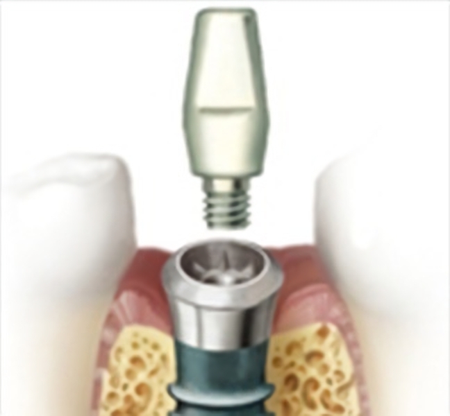 アバットメント(支台装置)の装着歯肉が治癒し、インプラントと顎の骨の結合が完了したら、インプラント上部にアバットメントと呼ばれる支台装置を取り付けます。その後、仮歯を装着し、人工歯の型取りを行います。